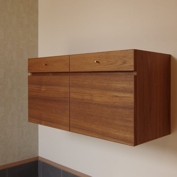 ビンテージ感を出す為、チークの突き板をブックマッチで練り付け、ツマミは真鍮素地のものを使用しました。